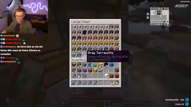 01:08:51Der Streamer setzt den Bau des Würfels fort und benötigt verschiedene Materialien wie Black Terracotta und Grey Terracotta. Es stellt sich heraus, dass er bestimmte Materialien nicht mehr besitzt und sie erneut beschaffen muss. Er erwähnt den besorgniserregenden Zustand der Ozeane im Spiel Minecraft, was zur Überfischung führt.