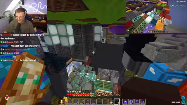 03:28:53Ein Großteil der Würfel in der Base wurde von der Community gebaut. Der Streamer erklärt, dass sie ein Event veranstaltet haben, bei dem jeder Teilnehmer die Möglichkeit hatte, seinen eigenen Würfel zu entwerfen und zu bauen. Besonders hervorgehoben werden das Auto, der Bienenwürfel, die Pisten, das Bücherregal und das Tetris-Ding, die allesamt von Einzelpersonen erstellt wurden. Der Chaoswürfel wurde sogar von 100 Leuten gleichzeitig gebaut.