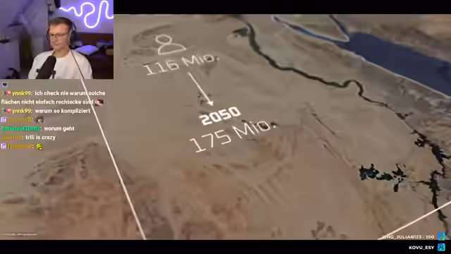 01:24:10Der Streamer berichtet über das gigantische Agrarprojekt 'New Delta' in Ägypten, bei dem die Regierung versucht, große Teile der Wüste in landwirtschaftlich nutzbare Flächen umzuwandeln. Er zeigt Satellitenbilder der kreisförmigen Bewässerungsanlagen und erklärt die technischen Details des Projekts. Es werden verschiedene Wasserquellen genutzt, darunter Wasser aus dem Nil und eine riesige Abwasseraufbereitungsanlage. Er erwähnt auch die kritische Haltung von Experten, die auf die enorme Kosten und die Nachhaltigkeit des Projekts hinweisen.