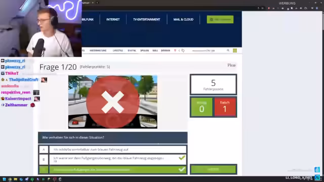 01:17:00Der Stream wechselt spontan zu einem ungewöhnlichen Segment: dem Test der Theorieprüfung für den Führerschein. Der Streamer und ein Mitspieler, Hugo, versuchen, eine echte Prüfung online zu bestehen. Hugo scheidet mit einer hohen Fehlerzahl aus, während der Streamer selbst ebenfalls Schwierigkeiten hat und einige Fragen als irreführend oder lernfeindlich kritisiert. Dieser abschließende Teil dient als humorvoller, aber auch frustrierender In-Game-Content und unterhält das Publikum mit interaktiven Elementen.