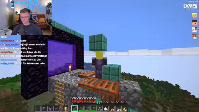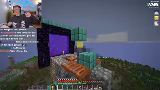 01:53:42Der Streamer plant einen Charity-Stream und erwähnt, dass Veto die Nachtschicht übernehmen wird. Außerdem wird über die Zusammenarbeit mit Heiko gesprochen, um eine komplexe Maschine zu bauen. Es handelt sich um einen Wind Charge Generator, der Spieler mit bis zu 50 Windcharges über 10.000 Blöcke hochkatapultieren soll, um eine Elytra-Launcher zu bauen. Gleichzeitig gibt es technische Server-Probleme, darunter ein ungewollter Portal-Warp durch Henke, der zu einem Golem-Spawn führt.