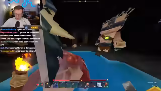 01:50:56Nachdem die Vorarbeiten für den Aufstieg abgeschlossen sind, macht sich der Streamer auf in das dunkle Biom, wo Kobalt-Erze gefunden werden können. Die Reise dorthin ist beschwerlich und führt ihn in eine riesige Höhle. Dort trifft er auf gefährliche Gegner wie Cinderclops und Fire Essence. Bei einem Kampf erleidet er erheblichen Schaden und erkennt, dass die Rüstung im Vergleich zu Minecraft einen nur geringen Schutzeffekt bietet.