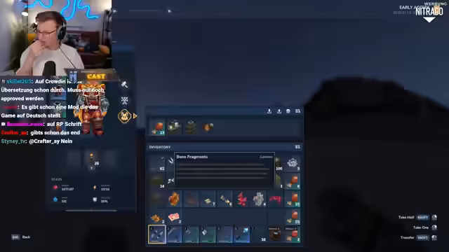 02:49:56Bei seiner Rückkehr in die Basis entdeckt der Streamer, dass ein anderer Spieler die gleiche Höhle genutzt und dieselben Ressourcen abgebaut hat. Dies bestätigt seine negative Meinung über den gemeinsamen Server, da sich die Spieler gegenseitig im Weg stehen und Loot teilen müssen. Trotz dieser Frustration ist er vom Spiel an sich begeistert, kritisiert aber die zu hohe Dunkelheit bei Nacht und unintuitive UI-Elemente wie das Reparieren von Werkzeugen.