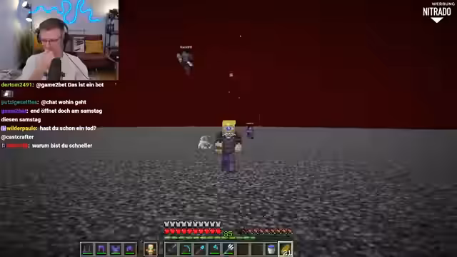 02:31:09Ein Hauptziel des Streams ist es, ein Loch in die Nether-Decke zu sprengen, um einfacher zu reisen und einen Durchbruch zu schaffen. Nach anfänglichen technischen Schwierigkeiten und gescheiterten Sprengungsversuchen mit TNT, Obsidian, Kolben und Falleingängen wird die Bedrock-Sprengung als äußerst stressig und fehleranfällig beschrieben. Es werden verschiedene Methoden getestet, viele Ressourcen gehen kaputt und die Suche nach einem geeigneten Sprengort gestaltet sich schwierig, da die Decke aus viel Bedrock besteht. Trotz aller Hindernisse wird der Durchbruch schließlich geschafft.
