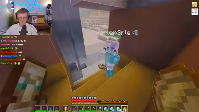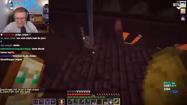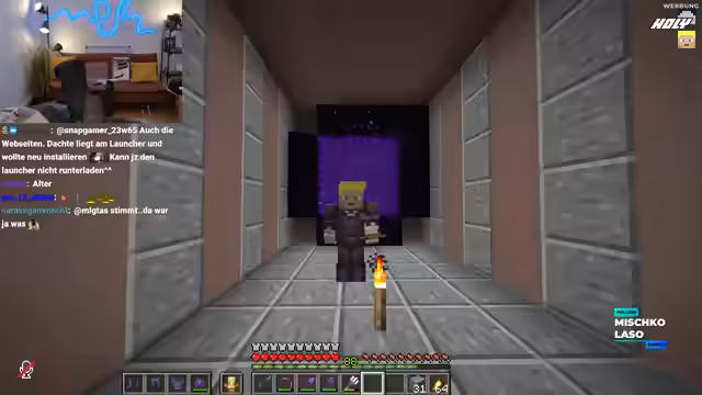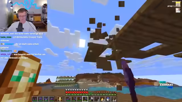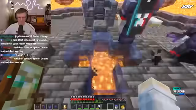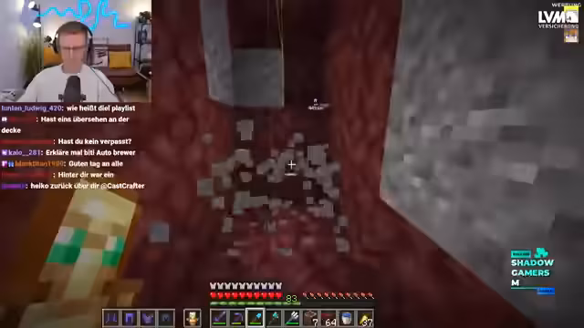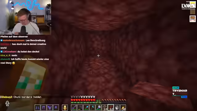 06:13:16Zuerst wird die Frage nach dem Zugang zur Nether-Decke geklärt. Die Voraussetzung ist ein Bedrock-Block auf Y=127, der mit F3 überprüft werden kann. Der Aufbau erfordert eine Enderperle, eine Leiter und spezielle Sprungtechnik. Dies ist ein wichtiges Bauelement für strategische Portale auf dem Server. Rückfragen und kurze Unterbrechungen durch Stream-Interaktionen sind Teil des dynamischen Austauschs.