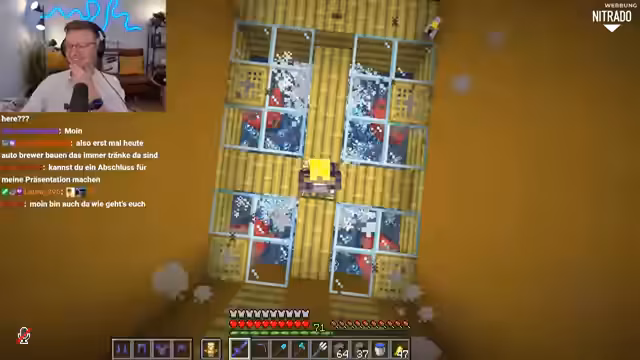 03:36:57Zu Beginn des Zeitraums wird die Planung einer automatisierten XP-Farm in der Netherfestung diskutiert. Es geht darum, einen Autobro zu platzieren, um Tränke für alle Spieler bereitzustellen, was den Farm-Prozess erleichtern soll. Der Streamer berichtet von anfänglichen Problemen mit den Drops, während die Zusammenarbeit mit anderen Spielern, wie Heiko, beschrieben wird, und die Bauidee für die Farm in der Nähe eines Lavasees skizziert wird. Es entsteht eine gemütliche Atmosphäre bei der gemeinsamen Farm-Aktion.