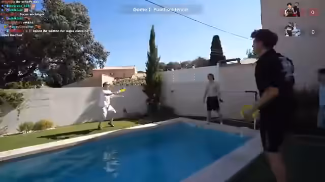 01:02:07Nach verschiedenen organisatorischen Vorbereitungen und Team-Auslosungen beginnt die Olympiade mit dem ersten Spiel: Ballwechsel über dem Pool. Die Teams müssen mit drei Versuchen versuchen, so viele Ballwechsel wie möglich zu erzielen. Das Spiel gestaltet sich schwieriger als erwartet, und trotz mehrerer Versuche gelingt es den Teams nicht, viele Ballwechsel zu schaffen. Der Streamer zeigt Enttäuschung über den Ablauf des Spiels.