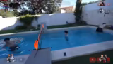 02:01:20Das zweite 2v2-Spiel findet im Pool statt und beinhaltet Wasservolleyball. Nachdem der Ball eine Weile unauffindbar war, wird das Spiel mit selbstgemachten Regeln aufgezogen. Die Teams kämpfen Punkt um Punkt, wobei besonders die wichtigen Matchpunkte spannend gestaltet sind. Das Spiel erfordert viel Koordination und Schnelligkeit im Wasser und endet knapp mit einem Sieg für ein Team.