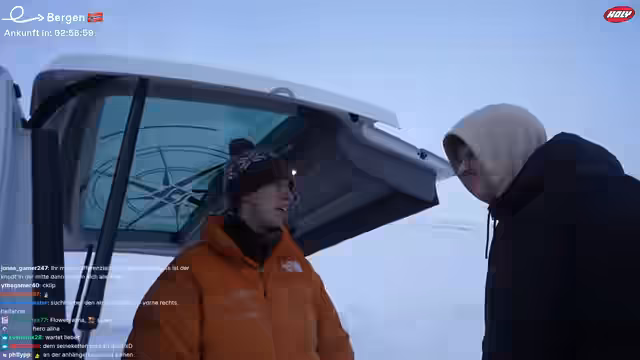 12:05:49Nach den technischen Herausforderungen gelingt der Start des Motors und die erste Fahrt mit dem Hausboot beginnt. Die Navigation gestaltet sich anspruchsvoll, da das Wasser mit treibenden Eisschollen bedeckt ist und der Motor zeitweise ausfällt. Während der Fahrt durch die karge Winterlandschaft Norwegens diskutieren die Streamer über die ungewöhnliche Erfahrung und das Ambiente.