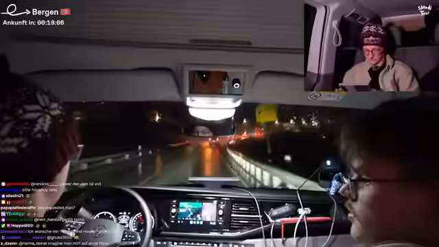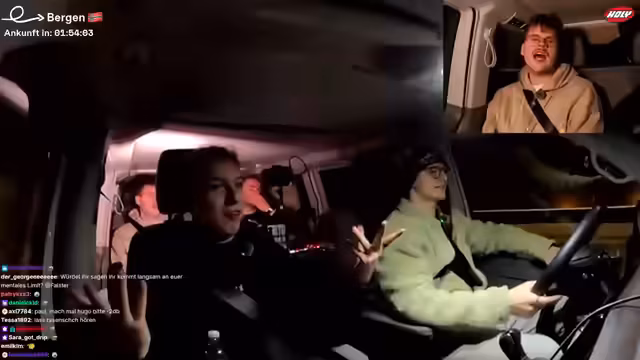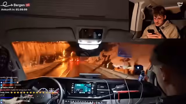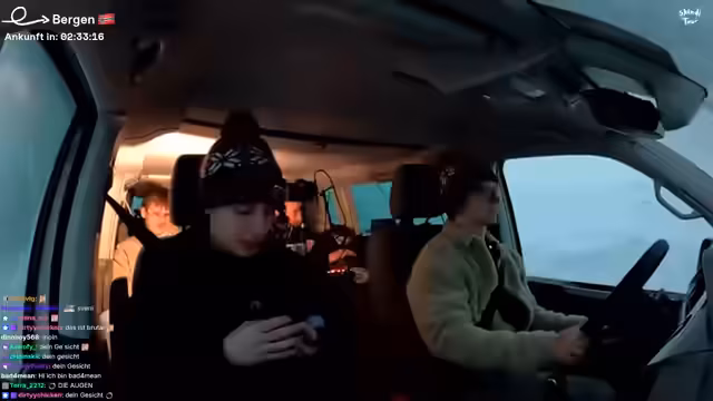10:02:34Die Streamer reflektieren die gefährliche Fahrt durch Schnee und Eis auf den Bergen. Es herrscht Einigkeit, dass die Situation angespannt war und sie kurzzeitig befürchteten, lange stecken zu bleiben. Das Gefühl der Erleichterung nach der Ankunft in Bergen wird betont, und man bewundert die Fähigkeiten des Fahrers, den Van sicher durch diese schwierigen Bedingungen manövriert zu haben.