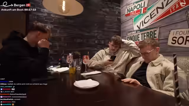 09:33:12Nachdem sie in der Stadt nach einem geeigneten Parkplatz gesucht haben, entscheiden sich die Streamer für ein Restaurant. Sie halten eine Unterhaltung über die Tatsache, dass Bergen die regenreichste Stadt Europas ist, und Heiko testet dies mit einer KI. Die Gruppe bestellt verschiedene Gerichte wie Pizza, Pasta und Getränke, und die Stimmung ist trotz des Regens und eines kleinen Zwischenfalls mit einer Hose gelöst.