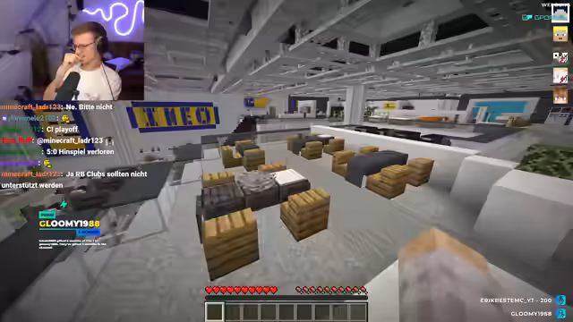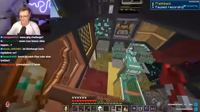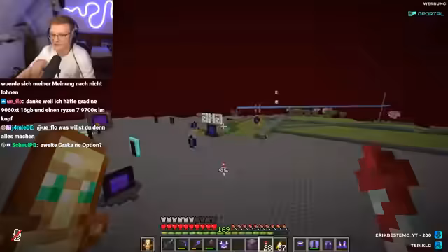 02:31:32Ein Zuschauer meldet technische Performance-Probleme in Minecraft, worauf der Streamer eine Ferndiagnose liefert. Er vermutet, dass die Ursache in den Einstellungen wie FPS-Limit, Grafikmodi oder der Java-Version liegt. Kurz darauf wird ein Wurf für die Erweiterung der Base gestartet, was der Streamer jedoch ablehnt, da dies den geplanten Ablauf des Videos stören und ihn vom Kernprojekt ablenken würde. Er konzentriert sich stattdessen darauf, den letzten Wür fertigzustellen.