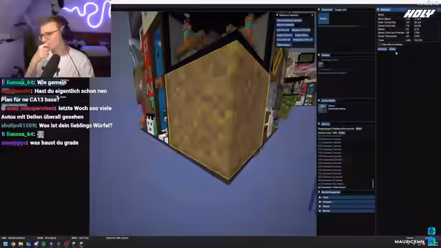 01:36:40Nachdem die Planungen für das Setup vorerst ruhen, wechselt der Streamer zum Minecraft-Server und konzentriert sich auf den Bau des letzten fehlenden Würfels in der Base, des sogenannten Community-Würfels. Zunächst wird der alte Würfel aufgeräumt, indem unnötige Blöcke wie Endtruhen und Köpfe entfernt werden, um den Innenraum zu säubern. Anschließend beginnt der Streamer mit dem Bau des neuen Würfels, indem er einen Betonrahmen außen herum platziert und mit verschiedenen Blöcken wie Moos, grünem Beton und Terrakotta weiterarbeitet.