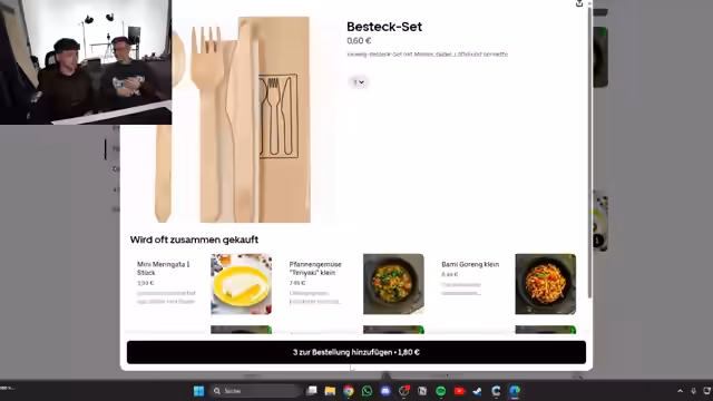 00:16:43Nachdem die technische Einrichtung des Streams geklärt ist, beginnen die Streamer mit der Recherche auf Lieferando. Sie filtern gezielt nach Restaurants ohne oder mit sehr wenigen Bewertungen. Nach anfänglichen Schwierigkeiten, passende Läden zu finden, entscheiden sie sich für ein asiatisches Restaurant namens 'Haji' mit einem mysteriösen, aber authentisch wirkenden Menü. Sie bestellen ein Bundle mit Bratnudeln, Erdnusssauce und Teriyaki, sowie Desserts und Besteck, um das komplette Erlebnis zu testen.
