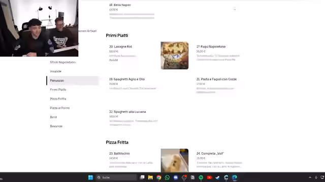 00:30:21Für den zweiten Gang wechseln die Streamer zu einem italienischen Restaurant. Beim Durchstöbern des Menüs stoßen sie auf seltsame und unappetitliche Produktbilder, insbesondere bei einer Lasagne, die rohe Zutaten zu zeigen scheint. Trotz der abschreckenden Bilder und der hohen Preise beschließen sie, eine Pizza mit Ricotta-Füllung zu bestellen, um die Qualität eines solchen Angebots zu bewerten. Sie äußern erste Bedenken, was die Essensqualität und Hygiene betrifft.