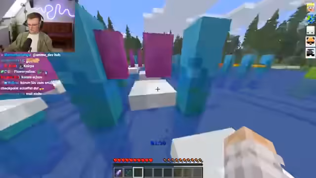 01:04:44Das Team erreicht fortgeschrittene, aber sehr anspruchsvolle Abschnitte des Parcours wie Amethyst-Sprünge und Kettensprünge. Ice Rice schafft den schwierigen Sprung mit dem Totem-Item, was ihm Punkte bringt. Malte und andere Spieler kämpfen mit einem spezifischen, als "Kinderverarsche" betitelten Sprung. Es kommt zu Missverständnissen und Punktabzug, als Spieler Checkpoints überspringen, um zu einem weiter vorne liegenden Teammitglied zu gelangen, was strategisch bedingt ist.