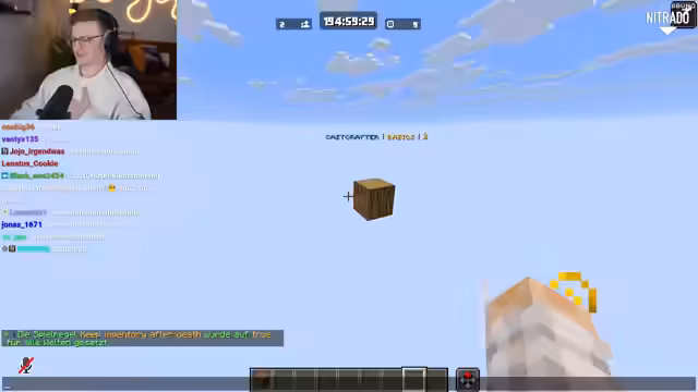 01:35:07Ein Spieler bittet um Hilfe bei der Vielzahl von Villagern, die als Spawn-Problem beschrieben werden. Der Streamer gibt den Rat, einige Villager zu töten, da es zu viele seien. Gleichzeitig werden technische Fragen geklärt, wie zum Beispiel die Anzahl der Blöcke, die TNT fallen kann, die laut dem Streamer null ist, da es sofort explodiert. Auch wird erklärt, wie man mit dem OneBlock-System funktioniert.