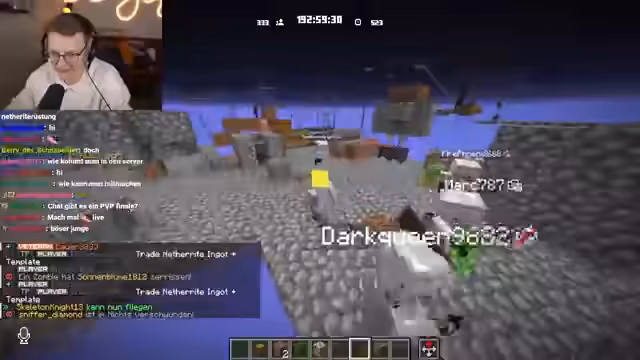 01:32:35Es wird über die Lore des Servers gesprochen, besonders über die Geschichte des Clans 'Oberüberhausen', der angeblich von einem Diktator gelöscht wurde. Andere Gruppen wie 'Bruce Plunks' und 'Kugelbeerenbande' werden als die aktuell größten Clans genannt. Es wird auch erwähnt, dass die Gruppengrößen und Existenzdauer der Clans öffentlich einsehbar sind und das als sehr spannend für die Zuschauer gilt.