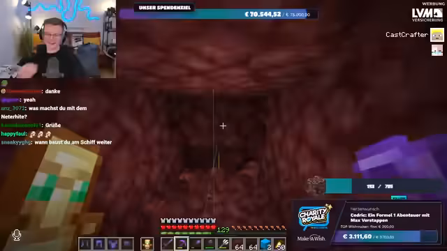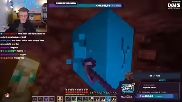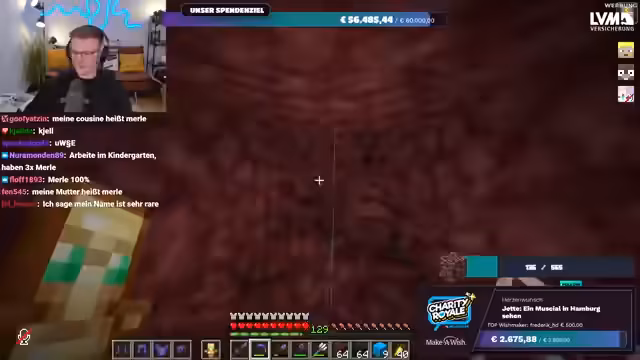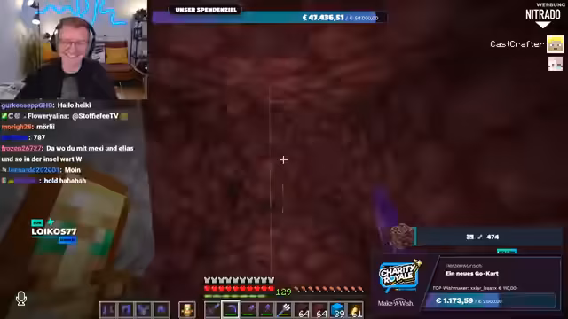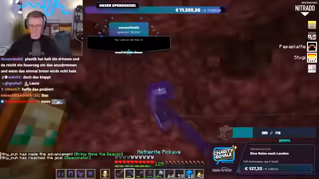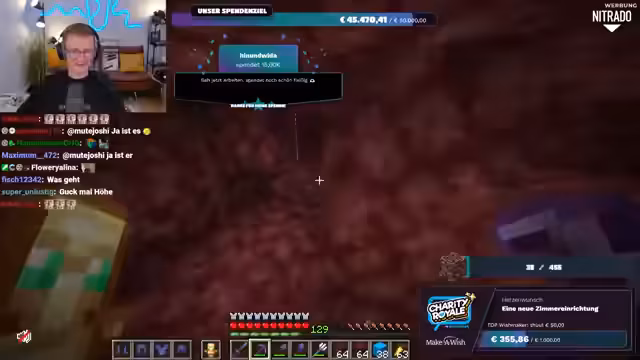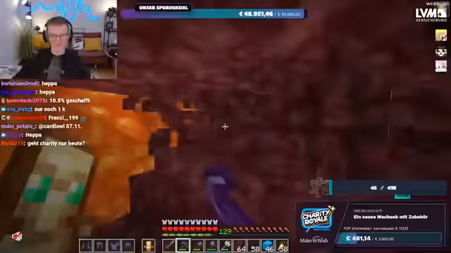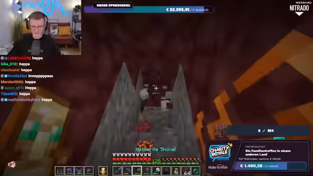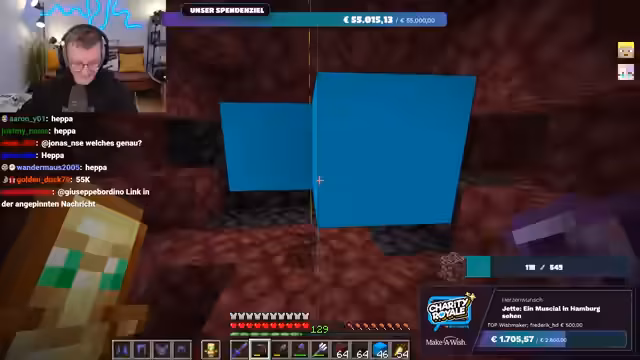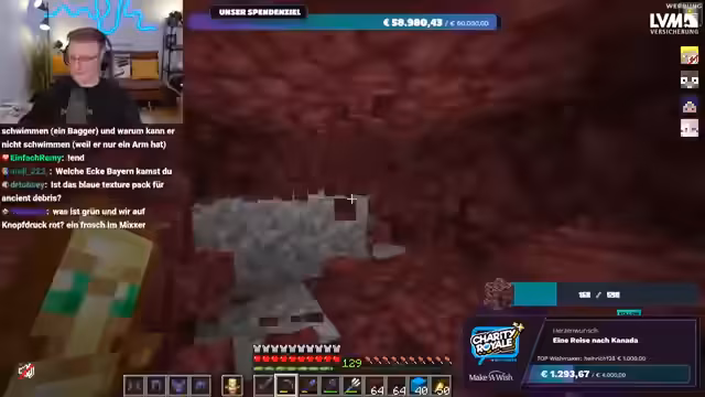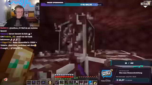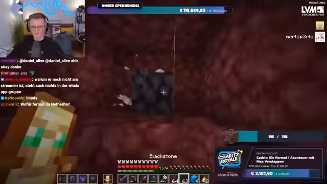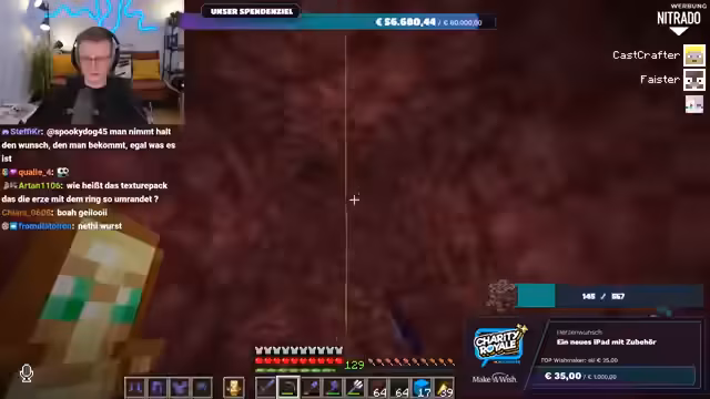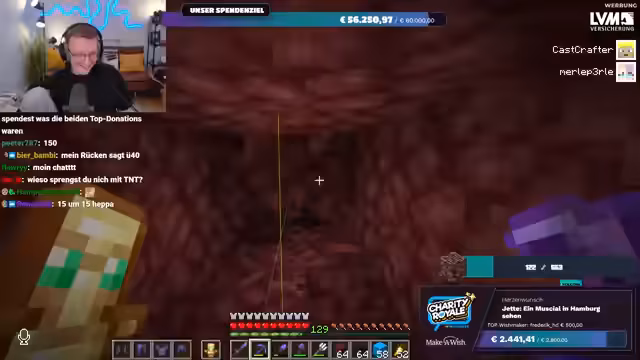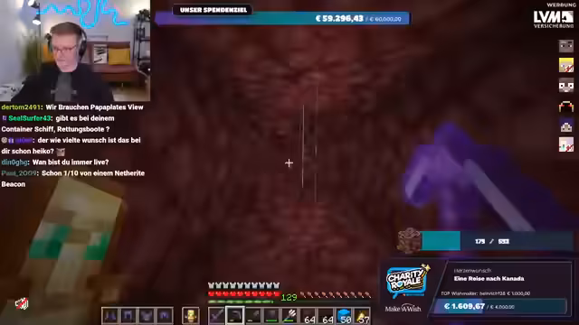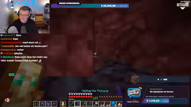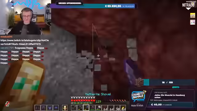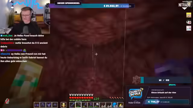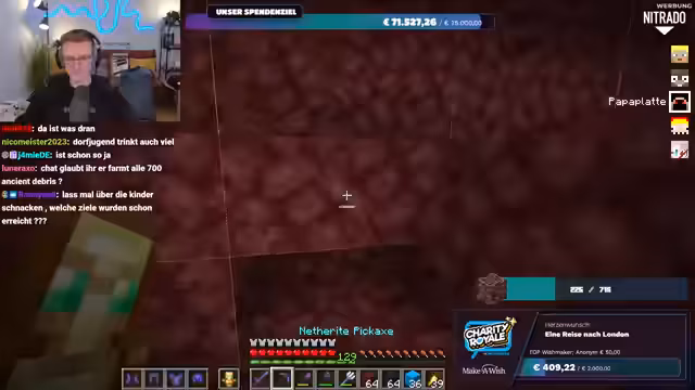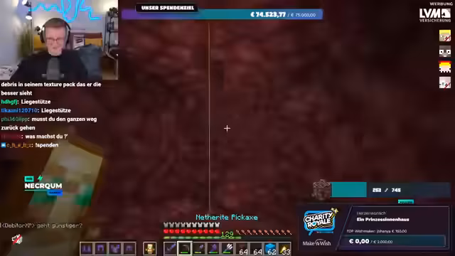 01:56:20Es wird nochmals klargestellt, dass das gesammelte Geld direkt an Make-A-Wish Deutschland oder Make-A-Wish Österreich geht, je nachdem, welche Option der Spender wählt. Es gibt keine Zwischenhändler oder Gebührenabzüge; das Geld gelangt direkt auf die Konten der Organisationen. Der Streamer bereitet sich nun darauf vor, im Spiel Ancient Debris zu farmen, um die im Spenden-Overlay angezeigte Menge zu erreichen. Er repariert seine Ausrüstung und sammelt Vorräte, um sich auf die bevorstehende Farming-Session im Nether vorzubereiten.