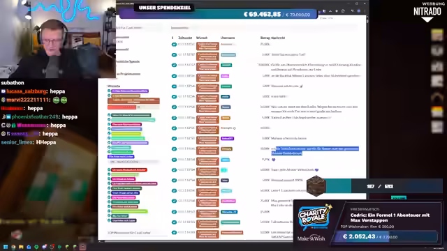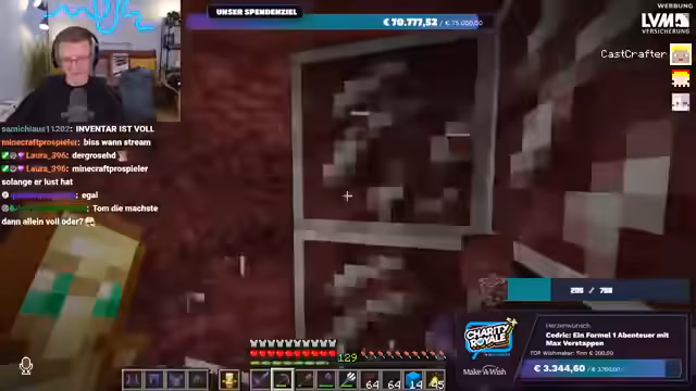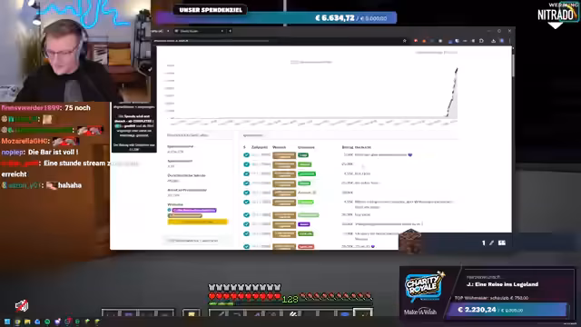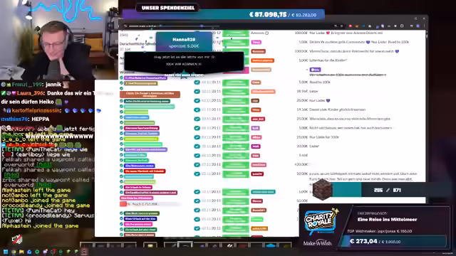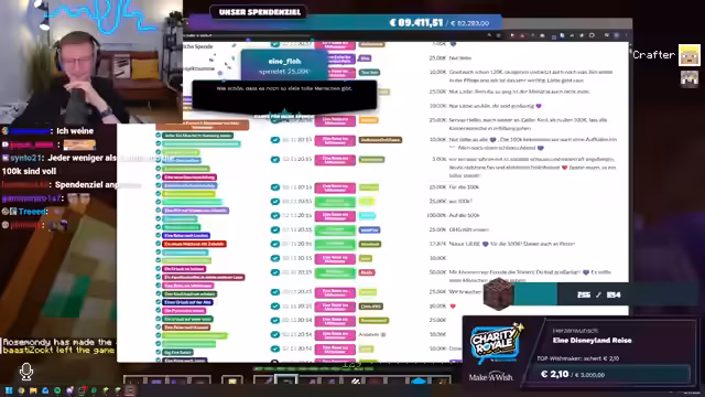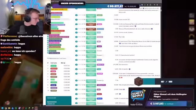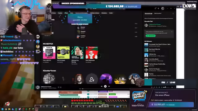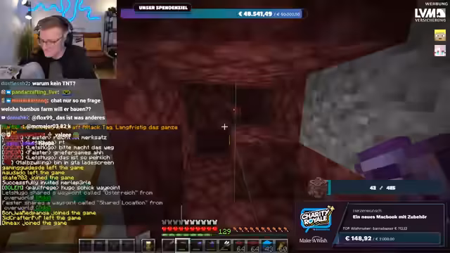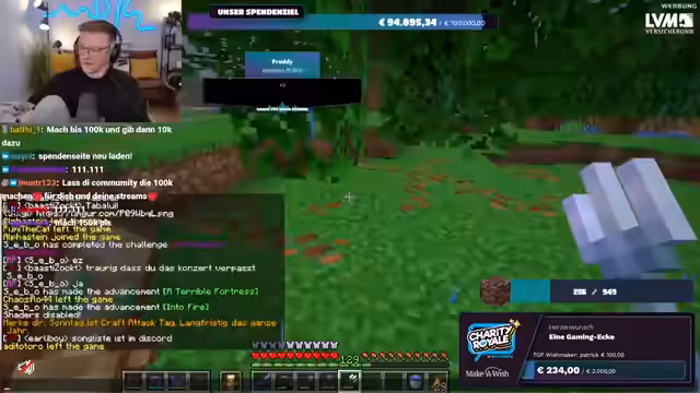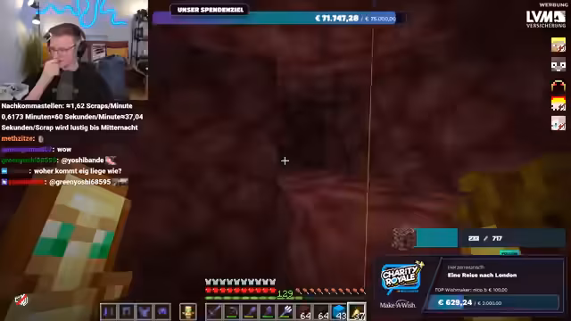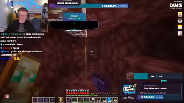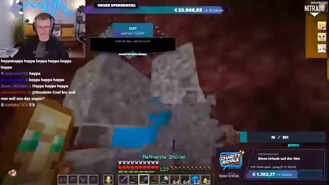 03:24:06Die Spendenbereitschaft der Community erreicht neue Höhen, als Spellinger eine unglaubliche Summe von 900 Euro spendet, gefolgt von Maximilian, der weitere 1000 Euro beisteuert. Diese massiven Beiträge treiben die Spendensumme weiter in die Höhe. Der Streamer ist sprachlos und bedankt sich immer wieder bei den Spendern. Kurz darauf wird ein weiterer Meilenstein erreicht: Die gesamte Charity Royale-Aktion hat insgesamt 100.000 Euro gesammelt! Innerhalb von dreieinhalb Stunden erreicht der Stream selbst 45.000 Euro. Trotz dieser Erfolge bleibt die Suche nach Ancient Debris weiterhin eine Herausforderung, was den Streamer dazu veranlasst, humorvoll über die geringe Ausbeute zu klagen.