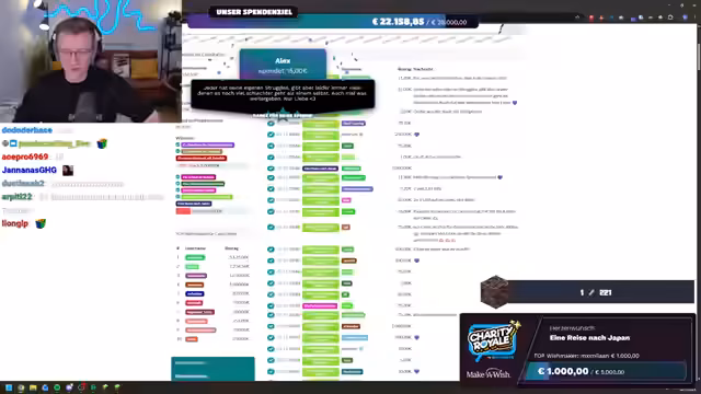 00:21:29Der erste Wunsch, für den gesammelt wird, ist eine Reise ins Disneyland für C., um die Avengers und Spider-Man zu treffen. Die Community zeigt sich äußerst spendenfreudig, und es wird schnell klar, dass das Ziel in greifbare Nähe rückt. Innerhalb kürzester Zeit werden zahlreiche Spenden von verschiedenen Beträgen getätigt, was zu einer schnellen Erfüllung des ersten Wunsches führt. Der Streamer ist sichtlich beeindruckt von der Großzügigkeit der Zuschauer. Nach nur einer halben Stunde ist das erste Spendenziel erreicht, und C. kann ins Disneyland reisen. Die Freude und Dankbarkeit über diesen Erfolg sind groß, und es wird betont, wie wichtig jede einzelne Spende ist, um solche Wünsche zu ermöglichen.