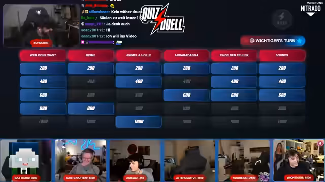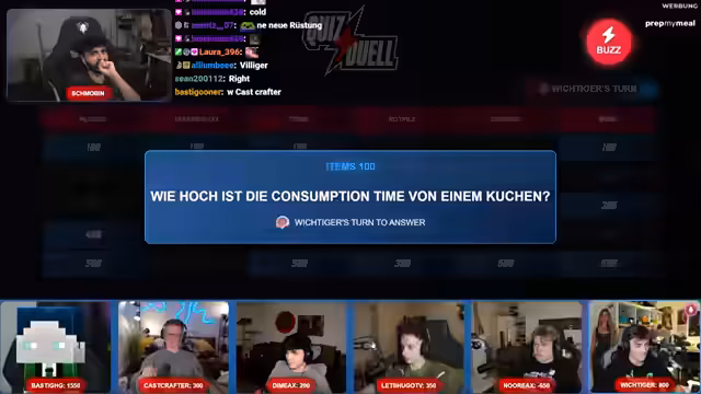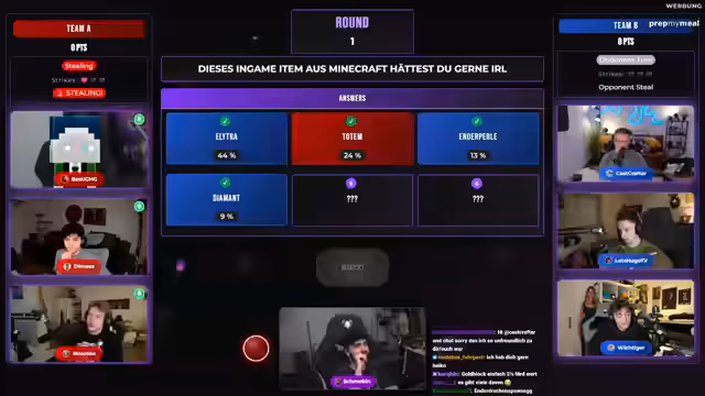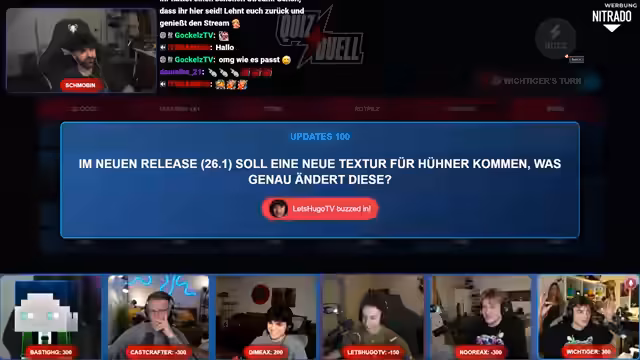 03:04:33Das Quiz startet mit einer Reihe von Fragen zu Minecraft-Themen, darunter Crafting-Rezepte für Armbrüste, Golems und aktuelle Spiel-Updates. Die Teilnehmer nutzen ein Buzzer-System, um ihre Antworten abzugeben, wobei technische Herausforderungen beim Buzzern teilweise auftreten. Die Fragen reichen von einfachen Crafting-Anleitungen bis hin zu spezifischen Details wie der Knockback-Resistance eines Wardens. Die Runde ist von humorvollen Interaktionen und Wettbewerb geprägt, mit Punktevergabe für korrekte Antworten und Strafabzug bei Fehlern.