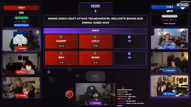 05:00:16Es folgen weitere Quiz-Runden, in denen Tiere, die in Minecraft eingeführt werden sollten, erraten werden. Nach einer intensiven Debatte über Capybara, Zebra und Krabbe entscheidet sich das Team für Capybara. Später geht es um Craft-Attack-Teilnehmer, die nur einmal teilgenommen haben, mit Diskussionen über Namen wie Platin, Paul Frege und Sidney. Die Debatte konzentriert sich auf aktuelle und neue Mitglieder der Szene.