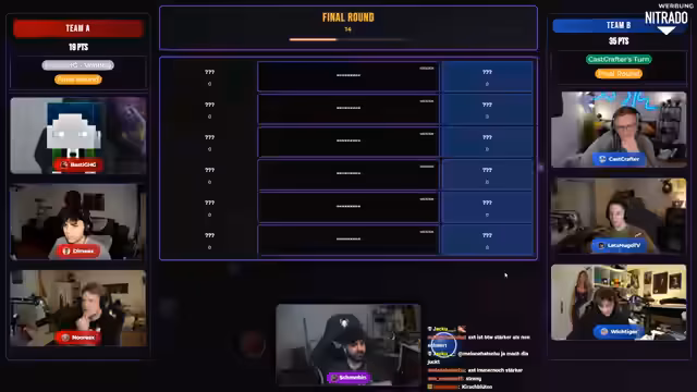 05:21:15Das Finale des Quizzes startet mit schnellen Fragen an die Teilnehmer Heiko, Hugo und Wichtiger, gefolgt von einer zweiten Runde mit Basti, Dima und Noreax. Es werden verschiedene Minecraft-Themen wie gefährliche Mobs, beste Craft-Attack-Staffel und schönste Blöcke abgefragt. Am Ende wird die Möglichkeit eines nächsten Streams am nächsten Montag erwogen und diskutiert, ob eine längere Session mit weiteren Spielformaten stattfinden kann.