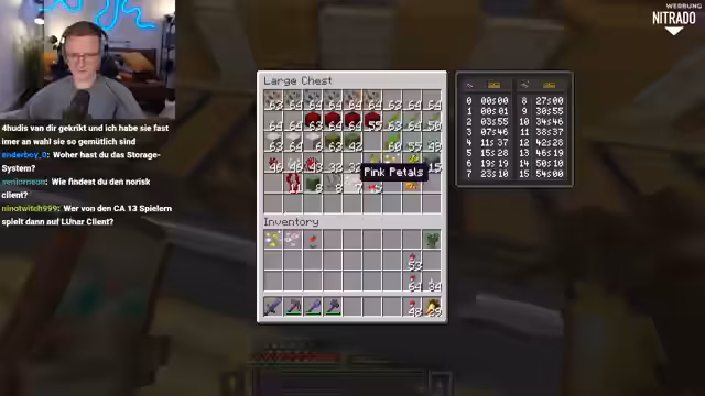 01:30:00Der Stream kehrt zum Aufbau des Sortiersystems zurück. Castcrafter arbeitet an der Filterlogik für verschiedene Item-Gruppen wie Flowers, Saplings, Animal Drops und Special Items. Er diskutiert Herausforderungen mit Redstone, etwa das Powering von Blöcken und das Vermeiden von Überläufen. Das Ziel ist, dass die Kupfergolems nahtlos funktionieren, obwohl Bugs auf dem Server Probleme verursachen. Es geht um detaillierte Kalkulationen für Stapelgrößen und die Platzierung von Containern für einen effizienten Fluss.