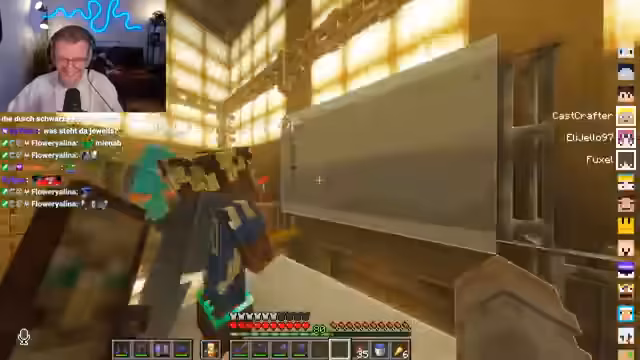 05:39:28Nach der intensiven Eventphase setzt der Streamer seine geführte Tour durch die verschiedenen Bauten fort. Er besucht die Baustellen von Zander, Baloui und Fuchs. Bei Fuchs' fliegender Plattform zeigt er sich beeindruckt vom modernen Baustil mit Redstone-Details wie wehenden Flaggen und Ventilatoren. Bei Revis Schloss, das von Felica mitgestaltet wurde, geht er sehr ins Detail und lobt die einzigartige Kombination aus Fachwerk, Terraforming und derVision einer Elfenburg. Die detailreiche Baugeschichte und die Inspiration aus der realen Welt werden besonders hervorgehoben.