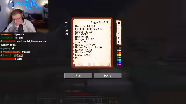 06:35:04Die Zuschauer interagieren über Songwünsche, was zu einer Diskussion über ein verfälschtes Songbuch führt. Währenddessen kommt es zu einer heftigen Auseinandersetzung mit dem Spieler Heiko, der die Base des Streamers als '2011 von 10' bewertet hat. Der Streamer fühlt sich von der herablassenden Bewertung, die ihm angeblich seine Tochter gezeigt hat, respektlos behandelt und fordert eine sachlichere Bewertung.