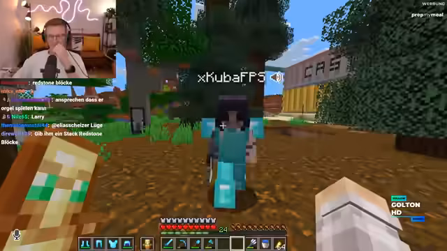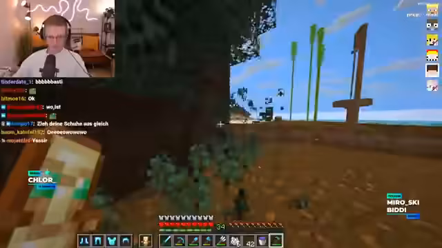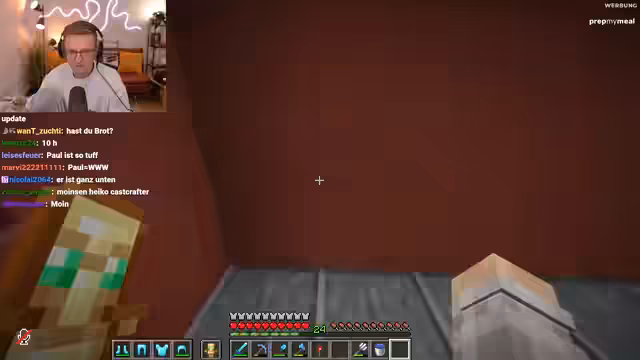 02:40:01Der Streamer offenbart einen Plan, einen Mitspieler namens Basti zu ärgern. Er hat ihm eine Tür gebaut, bei der man die Rüstung ausziehen muss, was alles dreckig macht. Danach hat er die ganze Base mit Schlamm und Blättern verdreckt. Sein Plan ist, dass Basti online kommt, er auf dem Boden rumpinselt und als Hausmeister auftritt, was als sehr smart bezeichnet wird.