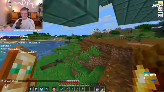 03:33:57Der Stream startet mit informellen Gesprächen innerhalb der Gruppe über Abwesenheiten und gemeinsame Aktivitäten wie Farmen und Bauen. Ein zentrales Thema ist der bevorstehende Spawn von Hugo, für den ein 'Boot-Prank' vorbereitet wird. Einige Spieler sammeln Holz und stellen Dispenser her, um Hugo mit zahlreichen Booten zu 'überraschen', sobald er erscheint. Die Vorfreude auf das Ereignis ist groß, und es gibt erste Vorbereitungen, wie das Markieren von Fallen und die Diskussion über den Ablauf.