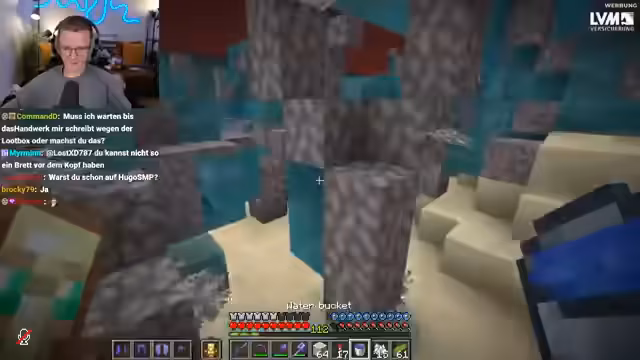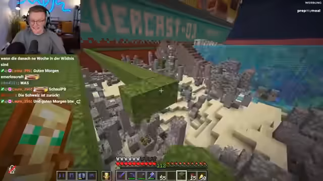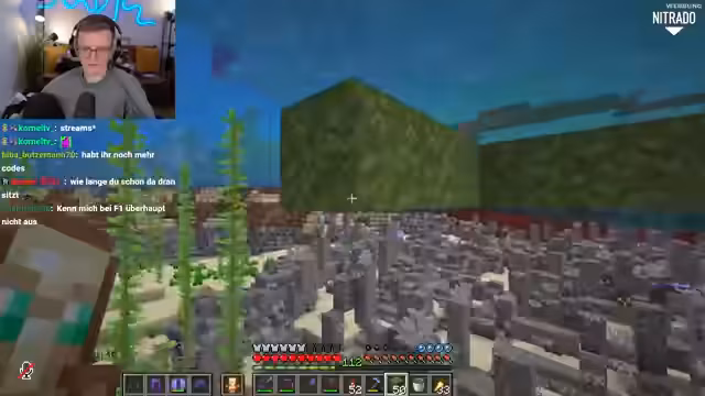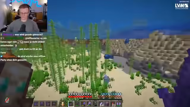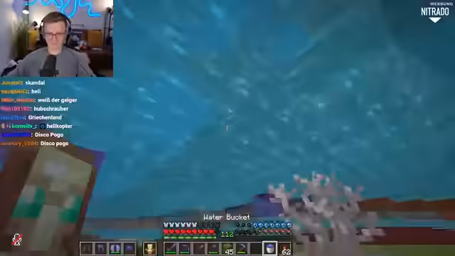01:13:41Während der Arbeit an der Wasserstruktur werden Skelette und Creeper bekämpft. Der Streamer entdeckt eine Seemine und erwähnt Flashbacks an frühere Events. Er überlegt, ob Waterlogging für untere Bereiche nötig ist, entscheidet sich aber, erst weiter zu bauen und die Struktur zu perfektionieren.