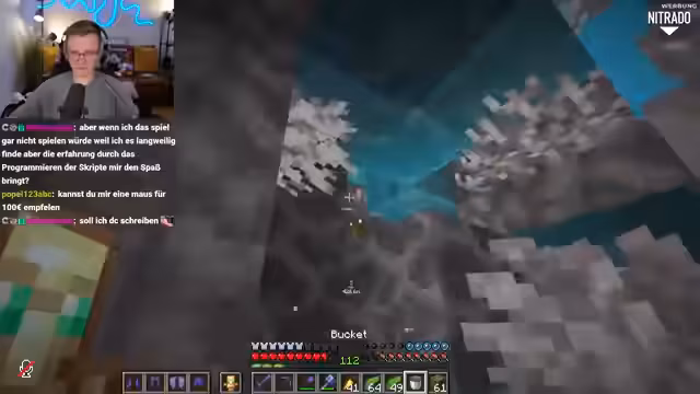 00:10:13Eine Taktik aus dem Chat wird diskutiert: Den oberen Bereich zu fluten, um zu hoffen, dass sich das Wasser verbindet. Falls nicht, sollen zwischendrin Quellen gesetzt werden, um den 'Stuff waterzuloggen'. Der Streamer plant, einen dicken Layer Wasser zu setzen und auf natürliche Verbindungen im Untergrund zu hoffen.