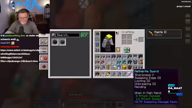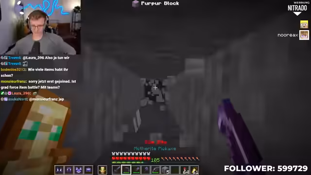 06:22:48Die Vorbereitungen für das „Force Item Battle“ laufen auf Hochtouren. Es wird über die Teamfarben und die Möglichkeit eines „Vogelkacken-Rüstungs“-Teams gescherzt. Die Beschaffung der fehlenden Netherit-Barren wird priorisiert, wobei ein Spieler bereits im Nether ist, um Ancient Debris zu farmen. Die Zeit drängt, da das Event um 20 Uhr beginnt und die Ausrüstung bis dahin fertig sein muss. Es werden weitere benötigte Gegenstände wie Windcharges, Totems, Enderperlen und Goldene Karotten besprochen, die größtenteils bereits im Hub verfügbar sind. Die Enchantments für die Werkzeuge werden diskutiert, wobei Silk Touch auf der Spitzhacke als nützlich erachtet wird, um Erze direkt abzubauen. Die Spieler werden aufgefordert, ihre Elytren mitzubringen, da diese für die Reise zur Event-Location unerlässlich sind. EP-Flaschen werden ebenfalls gesammelt, um Enchantments zu ermöglichen. Die Spieler treffen sich am Container, um gemeinsam zur Event-Location zu reisen. Die Regeln des „Force Item Battle“ werden erklärt: Sechs Zweierteams erhalten die gleiche Item-Vorgabe und müssen dieses Item in ihr Inventar bringen, um Punkte zu sammeln. Es ist eine Jagd nach Items, wobei keine Enderkisten, Shulkerboxen oder bereits auf dem Server vorhandene Kistenlager genutzt werden dürfen. Die Welt soll wie eine normale Survival-Vanilla-Welt behandelt werden. Bei Bedarf von End-Items dürfen Strongholds genutzt werden, auch wenn diese weit entfernt sind. Das Sterben ist nicht schlimm, und es wird überlegt, Betten an der Event-Location aufzustellen. Die Spieler werden gebeten, ihre Aufnahmen des Events zur Verfügung zu stellen, idealerweise ohne Copyright-Musik, damit schnell ein Video erstellt werden kann. Ein neues OBS-Plugin, das selektives Aufnehmen von Szenen ermöglicht (z.B. nur Gameplay und Facecam, ohne Alerts oder Werbepartner), wird als nützlich für solche Zwecke erwähnt. Die Teamzusammenstellungen werden finalisiert, wobei ein Spieler überrascht ist, nicht mit seinem erwarteten Teampartner zusammen zu sein. Die IP für den Server wird geteilt, und die Spieler werden gebeten, das neueste Texture Pack zu verwenden.