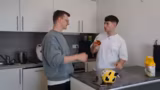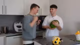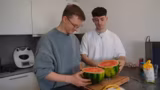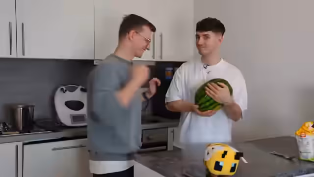 00:58:52Das dritte Rezept ist ein Minecraft-basierter „Heilungstrank“. In Minecraft wird dieser durch Goldäpfel hergestellt, die aus glitzernden Melonen und Goldbarren hergestellt werden. In Real Life wird eine Wassermelone als Basis verwendet, um den „Goldapfel“ zu simulieren. Bei dem Versuch, die Melone mit einem Hammer zu zerschlagen, um den Kern zu erreichen, werden nur rote Flecken an den Fingern erzielt. Stattdessen wird ein Messer benutzt, um die Melone aufzuschneiden.