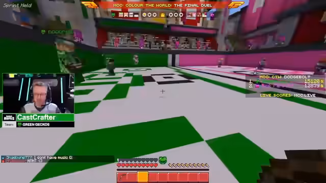 00:30:16Das Team "Green Geckos" wird als stark angesehen und kommt an die Bühne. Währenddessen bereitet sich das Cast-Team "castcrafter" auf die Übertragung vor. Es kommt jedoch zu erheblichen technischen Schwierigkeiten mit den Headsets und dem Discord. Die können den Stream nicht hören, was die Kommunikation massiv erschwert und zu Stress und kurzen, unkoordinierten Äußerungen führt. Das Setup muss mehrfach angepasst werden.