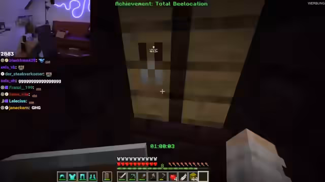 04:57:34Im weiteren Verlauf des Streams konzentriert sich der Streamer auf das Achievement "Bilocation", das er mit der Hilfe von Bienen und einem Bienenstöckchen erreichen muss. Er muss dafür eine Bürste craften und Gürteltiere jagen. Der Prozess ist mühsam und er verfehlt mehrmals sein Ziel. Parallel dazu baut er Eisen, um einen Amboss für das Verzaubern zu erhalten, und sucht nach einem Villager, um "Hired Help" zu vervollständigen.
