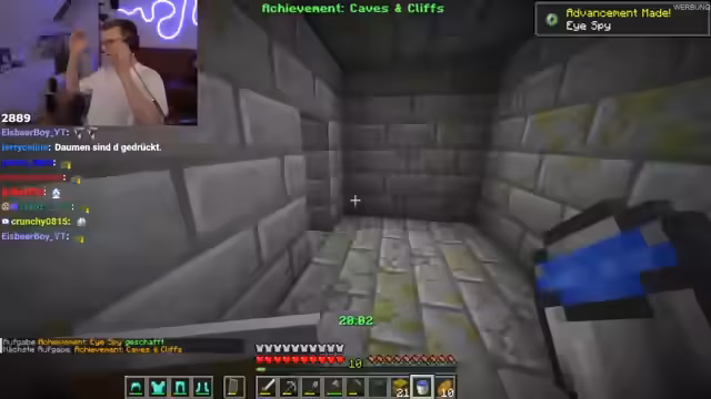 05:21:00Nachdem die meisten Achievements erledigt sind, wendet sich der Streamer dem Endportal zu. Er beginnt, Eye of Ender zu werfen, um die Festung zu finden. Die Suche ist extrem frustrierend und wird durch einen Bug, der die Koordinaten falsch anzeigt, zusätzlich erschwert. Er muss seine Strategie anpassen und den Ring um den Spawn neu absuchen, was zu viel Hektik und Stress führt.