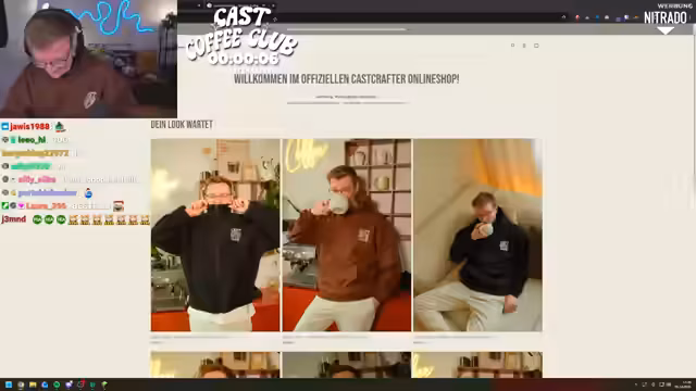 00:40:39Der Streamer präsentierte im Detail die Vielfalt des neuen Merchandise-Sortiments. Er zeigte den braunen Coffee Club Pulli, der auch in Schwarz und als Off-White-Shirt verfügbar ist. Besonders freute er sich auf eine neue Sherpa-Jacke mit einem Chaos Coffee Club Stick-Motiv sowie auf gedämpfte Waschungen bei T-Shirts und Sweatern in Grau. Ein Highlight dieses Releases sind erstmals Autogrammkarten, die der Streamer persönlich unterschreiben wird. Diese werden den aktuellen Bestellungen beiliegen und sind Teil des Weihnachtsdesigns.