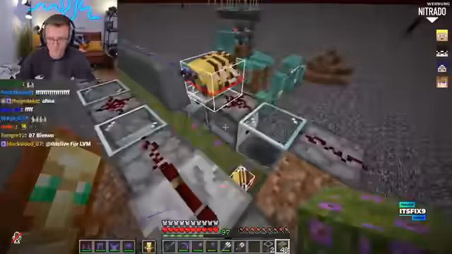 09:08:22Eine detaillierte Erstellung und Optimierung eines Redstone-Systems für ein Honigfilter steht im Mittelpunkt. Dabei wurde ein spezieller Autosorter entworfen, der ausschließlich Honigblöcke ausfiltert, während andere Gegenstände wie Scheren manuell nachgefüllt werden müssen. Das ständige Klacken und Summen der Anlage wurde als intensiv und sogar leicht ASMR-artig empfunden, was bei manchen Zuckungen auslöste.