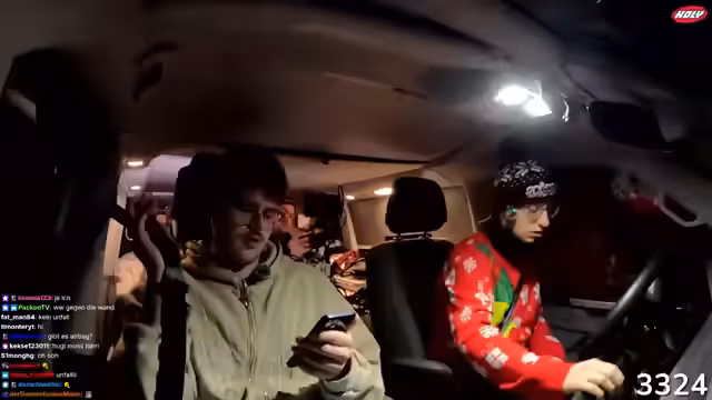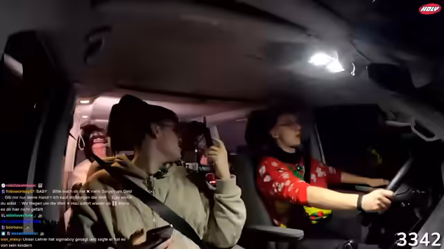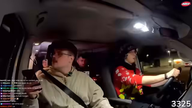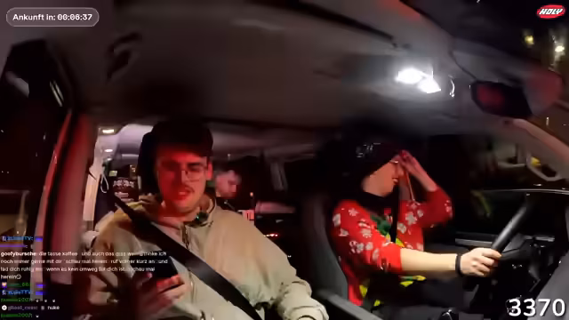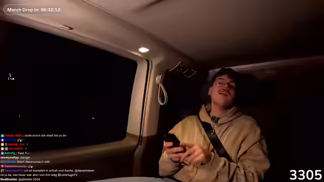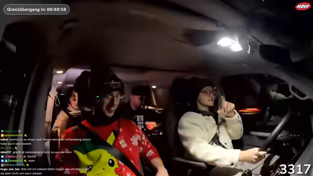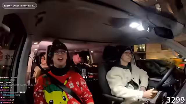 02:47:18Eine lange Phase des Streamings wird mit einer Anekdote über versehentlich gesetzte Wecker und daraus resultierendem Chaos begonnen. Nach einem Einkauf an der Raststätte wird der Kassierer beobachtet, der vermeintlich mit dem Auto der Gruppe kollidiert, aber tatsächlich einen anderen Van ansieht. Daraufhin fahren sie unbemerkt los, was zu begeistertem Jubel über den gelungenen Scherz führt. Der Stream wird genutzt, um auf den Merch-Shop hinzuweisen und eine Viewer-Frage zur Größe des Merch zu klären.