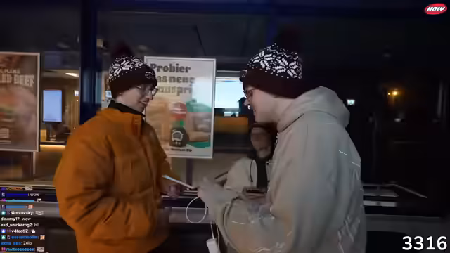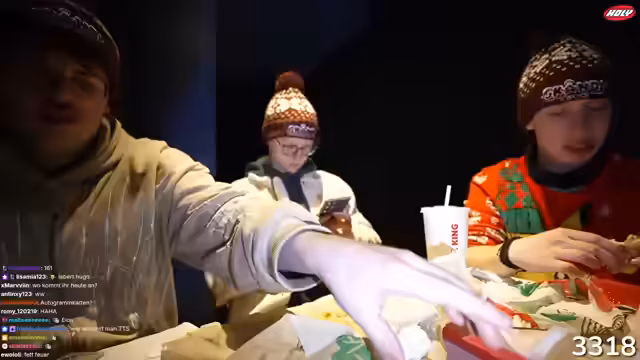 01:50:50Die Gruppe erreicht einen Burger King-Rasthof während die Öffnung des Shops bevorsteht. Es werden live die verschiedenen Merchandise-Artikel vorgestellt und getestet. Nach anfänglichen technischen Problemen mit dem Shop, die zur Ausverkäufe führen, wird der Fehler behoben. Die Zahl der Bestellungen steigt schnell an, und die Streamer überlegen, spontan bei einem Zuschauer vorbeizufahren, der in der Nähe wohnt, um ihm sein bestelltes Merchandise direkt zu überbringen.