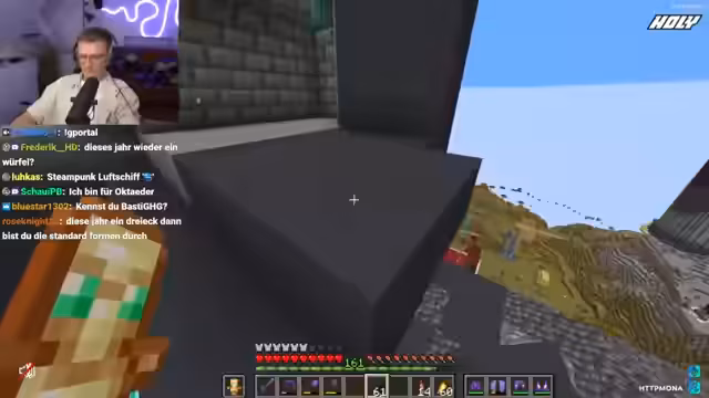 02:36:40Der Bau der Basis nimmt konkrete Formen an. Es werden Glas, Trapdoors und Fenskates für die Wassertank-Installation verbaut. Der Streamer stellt die Fertigstellung seiner ersten Basis in den Raum, wobei er vergleicht, wie seine bisherigen Projekte Cyberpunk und der Würfel aus vergangenen Staffeln empfunden wurden. Er betont, dass bei dieser Basis im Würfel-Design ein fehlender Block bereits den fertigen Eindruck zerstört und die Basis für ihn erst als komplett fertig gilt, wenn auch der letzte Mini-Würfel am Platz ist.