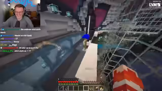 04:06:40Es folgt der Parkour-Contest auf dem Server 'Monument-der-Zuversicht.de' (1.21.4). Teams Rot und Blau werden gebildet, wobei Zuschauer zur Teilnahme eingeladen werden. Nach Chaos bei der Startaufstellung (frühzeitige Läufer) beginnt der Wettkampf schließlich um 15:40 Uhr. Das Ziel: Zwei Drittel jedes Teams müssen die Ziellinie erreichen, wobei Koordination und geschicktes Springen entscheidend sind.