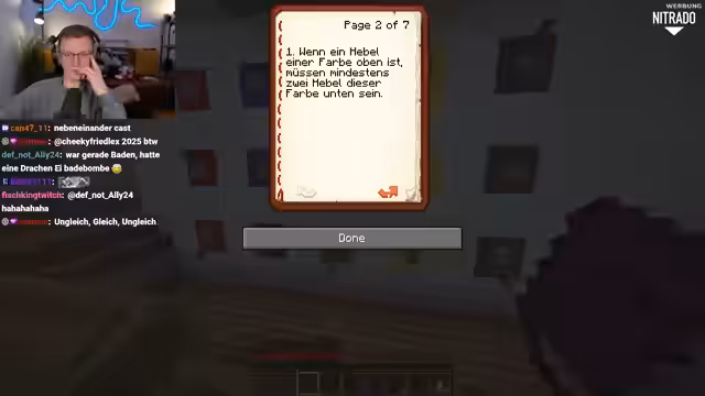 01:53:33Die Teams (Rot und Blau) werden final zusammengestellt, wobei fehlende Mitglieder per Discord nachgemeldet werden. Der Streamer betont die Präsenz erfahrener Builder und die Fairness-Regeln. Für die Building Challenge werden die Aufgaben erklärt: Bau eines Bauunternehmens und eines Fahrzeugbereichs mit spezifischen Berufsbezügen. Bewertungskriterien sind Kreativität, Funktionalität und Zeitmanagement. Parallel startet der Escape Room mit Hinweisen zu Vanilla-Modus, Soundeinstellungen und NPC-Interaktion.