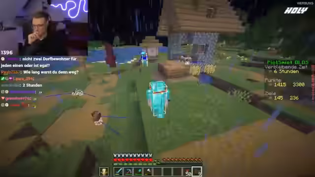 02:52:33Die Spieler haben die Orientierung verloren, finden aber eine gute Position. Die Monster scheinen die Spieler zu ignorieren, da sie zum anderen Dorf wollen. Die Monster spawnen hinter der Schmiede. Ein Spieler wird von einem Mitspieler gerettet. Ein volles Bienennest wird entdeckt. Ein Spieler kümmert sich um Bienen und Phantoms. Es wird diskutiert, ob man Phantoms in Booten schlagen kann. Ein Spieler ist im Arsch, weil er nicht mehr schreibt. Ein Spieler muss zurückkommen, um den Raid zu machen, sonst bekommt er das Wahnsinnig nicht. Beide Spieler sind im Boot. Der Überfall wird fortgesetzt. Eine Hexe wird erwähnt. Mit Elytra erhält man viel Schaden. Die Hexe wird getötet, um einen Zombie zu machen. Es wird besprochen, ob eine Wave noch kommt. Ein Walker wird im Wald gesichtet. Auf die Walker muss geachtet werden. Es gibt auch Berittene.