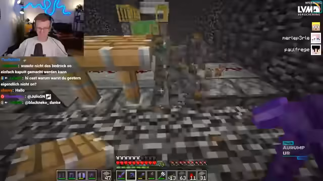 12:27:58Nach einem Verlust des Equipments muss alles neu hergestellt werden, was als mühsam empfunden wird. Es wird die Regel diskutiert, dass das zweimalige Erledigen derselben Aufgabe sich beim zweiten Mal „scheiße anfühlt“. Als Beispiel wird die kaputte XP-Farm genannt, bei der die Allays verschwunden sind und nun wieder vermehrt werden müssen. Obwohl dies schnell gehen könnte, wird es als unspaßige Arbeit empfunden. Das Reparieren von Farmen wird generell als unbeliebt bezeichnet. Es wird auch über die Möglichkeit gesprochen, sich später bei anderen Spielern mit Eisen zu bedienen, sobald die Farm wieder funktioniert. Die Situation verdeutlicht die Frustration über repetitive Aufgaben in Minecraft und die Notwendigkeit, sich nach Rückschlägen neu zu motivieren.