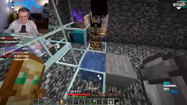 05:12:06Nach dreieinhalb Stunden Arbeit ist der gesamte Bereich leergefegt, und der Void-Durchbruch steht kurz bevor. Der Streamer hat eine Maschine benutzt, um das Bedrock abzubauen und den letzten Layer zu erreichen, der sie vom Nichts trennt. Paul möchte unbedingt ins Void fallen, und es wird geplant, ihm diesen Wunsch zu erfüllen, indem ein Loch geöffnet wird. Zuvor wird noch über Nieks Gefängnis gesprochen, das der Streamer für ihn gebaut hat. Niek loggte sich einmal ein, landete im Gefängnis mit einem Elder Guardian und schreienden Ziegen und hat sich seitdem nicht mehr eingeloggt. Zur Eröffnung müssen die Spieler Niek befreien, der in einem Obsidian-Kasten festsitzt.